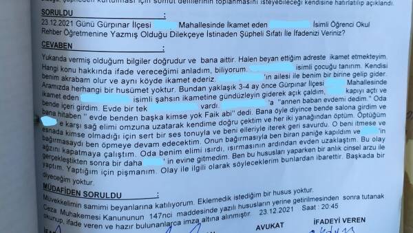 Στο παρακάτω έγγραφο από την δικογραφία, διακρίνουμε να λέει μεταξύ άλλων και τα εξής : : Πριν από 3-4 μήνες χτύπησα την πόρτα και όταν μου άνοιξε η χχχχχ ρώτησα αν είναι κάποιος στο σπίτι. Εκείνη μου απάντησε “Θείε Φαίκ εκτός από εμένα δεν υπάρχει άλλος στο σπίτι”. Όταν μου είπε έτσι έβαλα το δεξί χέρι μου στον ώμο της, την τράβηξα και την φίλησα στα μάγουλα. Όταν την φίλησα αυτή με έντονο τόνο φωνής με έσπρωξε απότομα προς τα πίσω. Αν δεν με έσπρωχνε και δεν φώναζε, εγώ θα συνέχιζα να την φιλάω. Όταν φώναξε εγώ πανικοβλήθηκαν λίγο και προσπάθησα να της κλείσω το στόμα. Τότε εκείνη μου δάγκωσε το χέρι. Μετά από το δάγκωμα έφυγα από το σπίτι. Μετά από το περιστατικό αυτό δεν πήγα στο σπίτι της χχχχχχ. Έκανα αυτές τις πράξεις με μία στιγμιαία σεξουαλική επιθυμία. Μετανιώνω για αυτό.