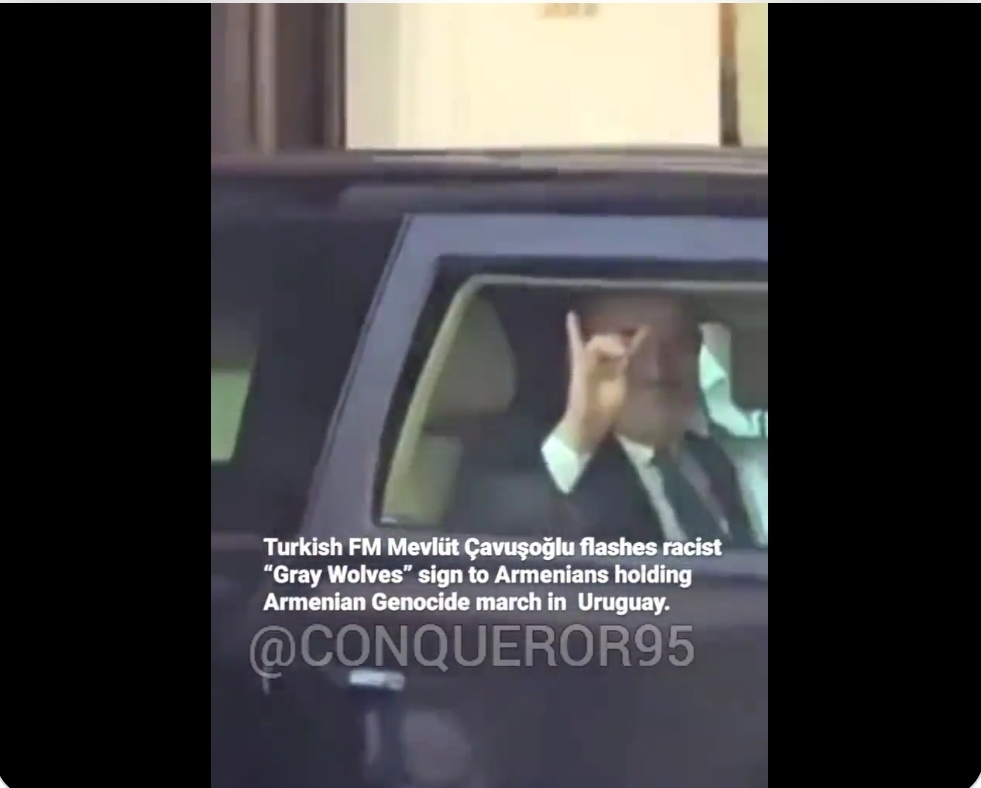 Turkey’s FM Çavuşoğlu demonstrates the sign of racist “Grey wolfs” organization to Armenians protesting in Uruguay. This is the only thing we need to know about Turkish foreign policy and attitude towards Armenia & Armenians on the eve of another anniversary of #ArmenianGenocide pic.twitter.com/xV5BpfApIz
