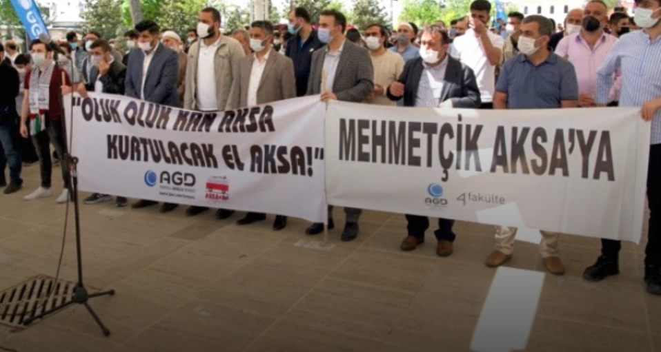 Το αριστερό πανό γράφει ¨Αν το αίμα ρεύσει, το τέμενος Ακσά θα σωθεί¨