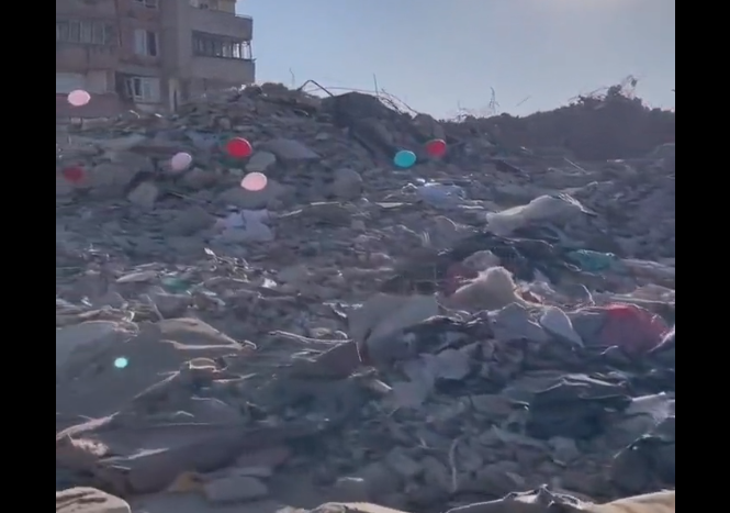 Στην Αντιόχεια προς ανάμνηση των παιδιών που καταπλακώθηκαν από τα χαλάσματα, έβαλαν μπαλόνια στα ερείπια….