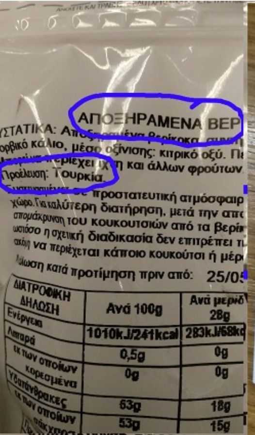 Τα αποξηραμένα βερίκοκα Τουρκίας έχουν, δυστυχώς, πλημμυρίσει την ελληνική αγορά. Τα βερίκοκα της φωτογραφίας κυκλοφορούν στα υπερκαταστήματα (σούπερ μάρκετ).