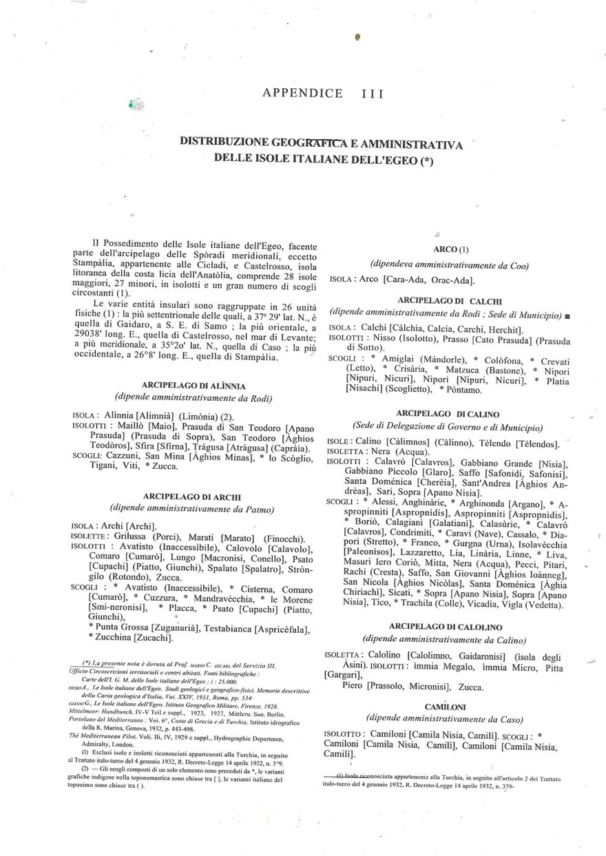 Παραθέτουμε σήμερα την πρώτη σελίδα του παραρτήματος (Appendice III), στην οποία αναφέρονται ξεκάθαρα τα Ίμια (immia Megalo, immia Micro), στο Αρχιπέλαγος της Καλολίμνου (ARCIPELAGO CALOLINO). Και φυσικά τα Ίμια περιέρχονται στην κατοχή της Ελλάδας που αποτελεί, στα Δωδεκάνησα,διάδοχο κράτος της Ιταλίας. Όπως βλέπετε, καταγράφονται αναλυτικά από νησιά (ISOLA), έως βραχονησίδες (SCOGLI). Έχουμε στη διάθεσή μας και άλλες τρεις σελίδες με τα υπόλοιπα «νησαία εδάφη» των Δωδεκανήσων. Στο Αρχιπέλαγος της Καλολίμνου, υπάρχει επίσης και η νησίδα Zucca (Τσούκα), την οποία πήραν ετσιθελικά, οι Τούρκοι, μετονομάζοντάς την σε Topan. Είχαμε γράψει δύο σχετικά άρθρα αλλά ο χλευασμός και οι αμφισβητήσεις από κάποιους, μας έκαναν να μην ασχοληθούμε πάλι με το θέμα. Αν κάποιοι δεν ενοχλούνται από την κατάληψη ελληνικών εδαφών, τι μπορούμε να κάνουμε εμείς;