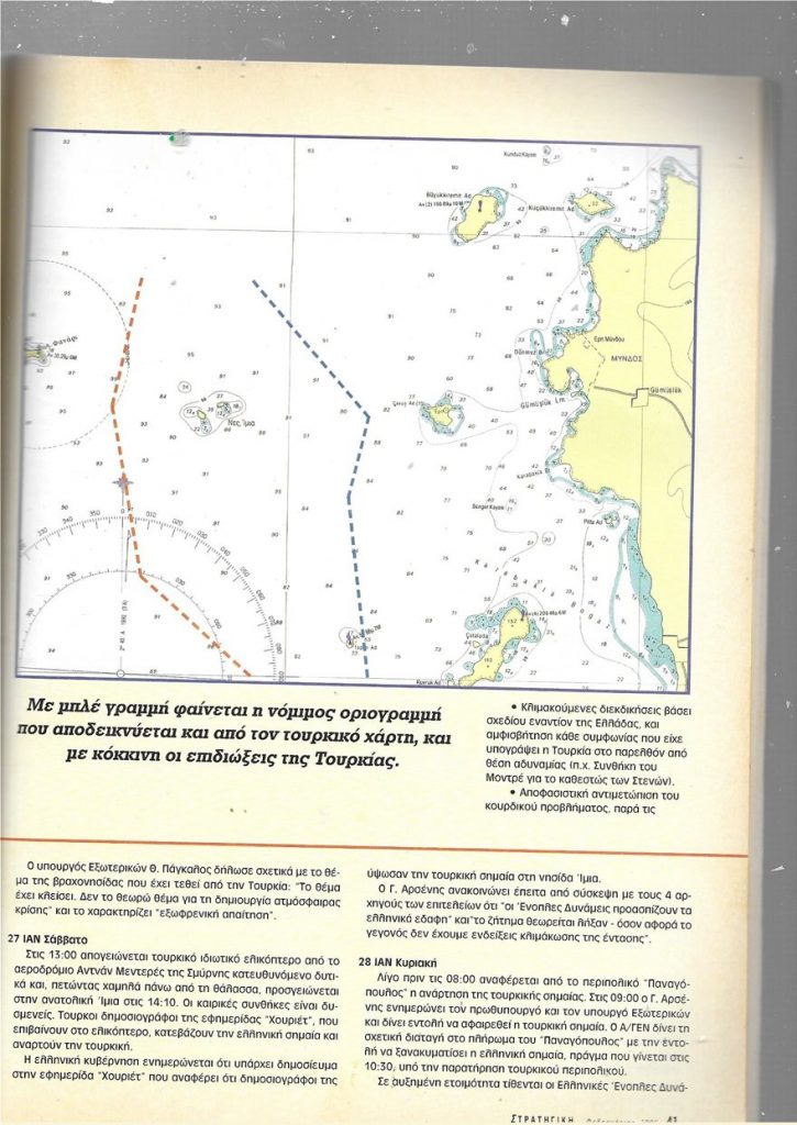 «Το συγκεκριμένο αυτό καθεστώς κυριαρχίας θα επιβεβαιώσει, κατά βάση η διμερής ιταλοτουρκική σύμβαση της 4ης Ιανουαρίου 1932, καθώς και το πρωτόκολλο της 28ης Δεκεμβρίου του ίδιου έτους. Ως γνωστόν, με την πρώτη συμφωνία καθοριζόταν «η κυριότητα των νήσων, νησίδων και βράχων που βρίσκονται μεταξύ του Καστελλορίζου και των ακτών της Ανατολίας, καθώς και επί της νήσου Καρά-Αντά» και με τη δεύτερη του υπολοίπου τμήματος «των θαλασσίων ιταλοτουρκικών συνόρων». Οι αιτιάσεις που προβάλλουν οι Τούρκοι για το πρωτόκολλο της 28/12/1932, είναι αβάσιμες.