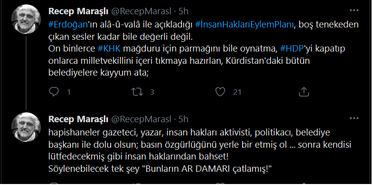Όπως εξαίρετα σχολίασε ο Κούρδος διανοούμενος Ρετζέπ Μαρασλί : ¨Το Σχέδιο Δράσης που ανακοίνωσε ο Ερντογάν δεν αξίζει ούτε σαν τον ήχο που κάνει ένας άδειος τενεκές. Δεν κουνάς ούτε το δάχτυλο σου για τα δεκάδες χιλιάδες θύματα των προεδρικών διαταγμάτων, κλείνεις το κόμμα HDP, ετοιμάζεσαι να φυλακίσεις δεκάδες βουλευτές του HDP, διορίζεις επιτρόπους σε όλους τους δήμους στο Κουρδιστάν, γεμίζεις τις φυλακές με δημοσιογράφους, συγγραφείς, ακτιβιστές ανθρωπίνων δικαιωμάτων, πολιτικούς και δημάρχους, ισοπεδώνεις την ελευθεροτυπία και μετά μιλάς για ανθρώπινα δικαιώματα λες και θα δωρίσεις κάτι¨ .