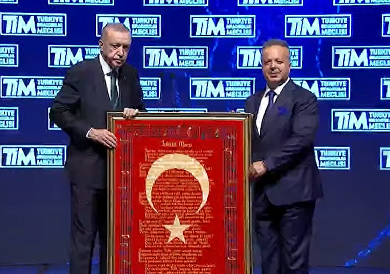 Επίσης στο τέλος της εκδήλωσης o Ισμαήλ Γκιουλέ-πρόεδρος της Ένωσης Εξαγωγέων χάρισε στον Ερντογάν ένα χαλί σε κάδρο. Το χαλί όπως ανέφερε η παρουσιάστρια είναι από μαλλί, υφάνθηκε σε 120 μέρες και έχει πάνω τους στίχους και τις νότες του τουρκικού εθνικού ύμνου…