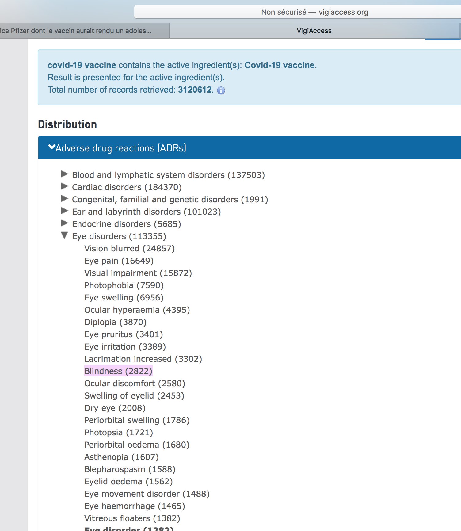 Εχουν καταγραφεί 2822 περιπτώσεις τύφλωσης μετά τον εμβολιασμό σύμφωνα με την ιστοσελίδα φαρμακοεπαγρύπνησης http://vigiaccess.org