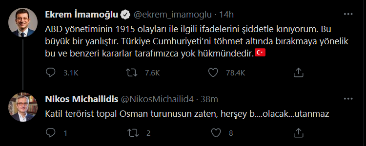“Καταγγέλλω έντονα την σχετική με τα γεγονότα του 1915 φράση της κυβέρνησης των ΗΠΑ. Αυτό είναι ένα μεγάλο λάθος. Αυτή και άλλες παρόμοιες αποφάσεις που ενοχοποιούν την Τουρκική Δημοκρατία δεν έχουν καμιά εγκυρότητα για την πλευρά μας