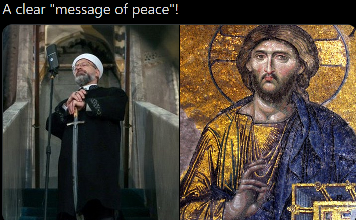 Ο Πρόεδρος της «Διεύθυνσης Θρησκευτικών Υποθέσεων» του τουρκικού κράτους (ανώτατη ισλαμική αρχή της Τουρκίας), Ali Erbas, παρέδωσε ένα κήρυγμα Ραμαζανιού για τους μουσουλμάνους, στην εκκλησία της Αγίας Σοφίας, που μετατράπηκε σε τζαμί πριν από λίγο καιρό, ΜΕ ΣΠΑΘΙ ΣΤΟ ΧΕΡΙ.