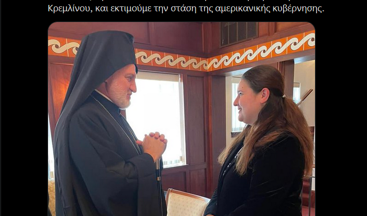 Γράφει ”  Επισκέφθηκα την Πρέσβη της Ουκρανίας @omarkarova στην Ουάσινγκτον και εξέφρασα την αμέριστη συμπαράστασή μας στον oυκρανικό λαό. Καταδικάζουμε τον πολιτικό και εκκλησιαστικό ιμπεριαλισμό του Κρεμλίνου, και εκτιμούμε την στάση της αμερικανικής κυβέρνησης¨