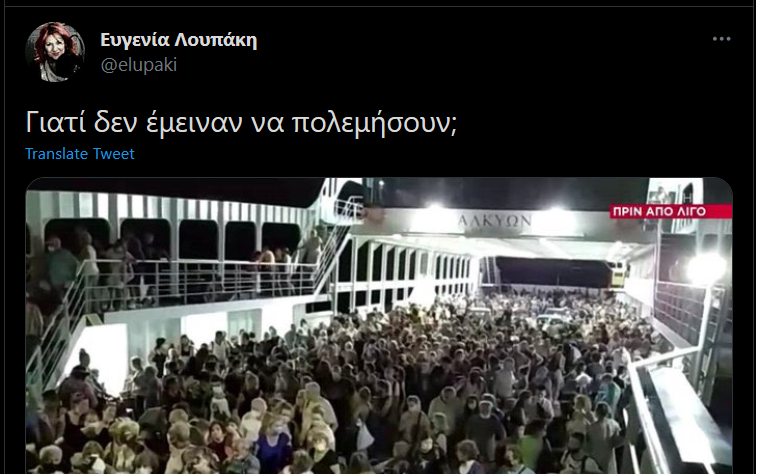 Προφανώς ειρωνεύεται το επιχείρημα πολλών που δεν αντιλαμβάνονται ότι υπάρχουν φορές που γίνεσαι πρόσφυγας χωρίς να το θέλεις. Είναι επιχείρημα (το “γιατί δεν κάθονται στον τόπο τους να πολεμήσουν και έρχονται εδώ”) που το χρησιμοποιούν πολλοί. Οπότε τώρα τους το “επιστρέφει” να το συλλογιστούν αυτοί που το χρησιμοποιούν για άλλους. Μπορεί κάποια στιγμή, όσο ασφαλείς και να αισθάνονται, να το φέρει η μοίρα (ή ο θεός τους για τις αμαρτίες που έκαναν) να αναγκαστούν και αυτοί να αφήσουν τα σπίτια τους και να βρεθούν στη μέγιστη ανάγκη. Αυτό λέει η Λουπάκη, και -ανεξάρτητα αν τη συμπαθώ ή όχι-, εδώ μια χαρά το θέτει! Ελπίζω να ξυπνήσουμε και να αντιμετωπίζουμε πλόν τον “ξένο” που έχει ανάγκη ως άνθρωπο πρωτίστως. Αυτά. Σε ό,τι αφορά τον Κρατερό, αυτός πού κολλάει εδώ; Ή γράφουμε έτσι για να γράφουμε; Σοβαρευτείτε λίγο!