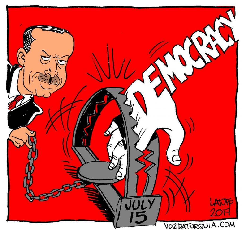 Ο ασφυκτικός έλεγχος της τουρκικής δικαιοσύνης ο οποίος την μετατρέπει σταδιακά σε τυφλό όργανο του καθεστώτος, σε σημείο να φυλακίζονται ακόμα και ανήλικοι με την κατηγορία «εξύβρισης» και «προσβολής» του Ρ.Τ. Ερντογάν,