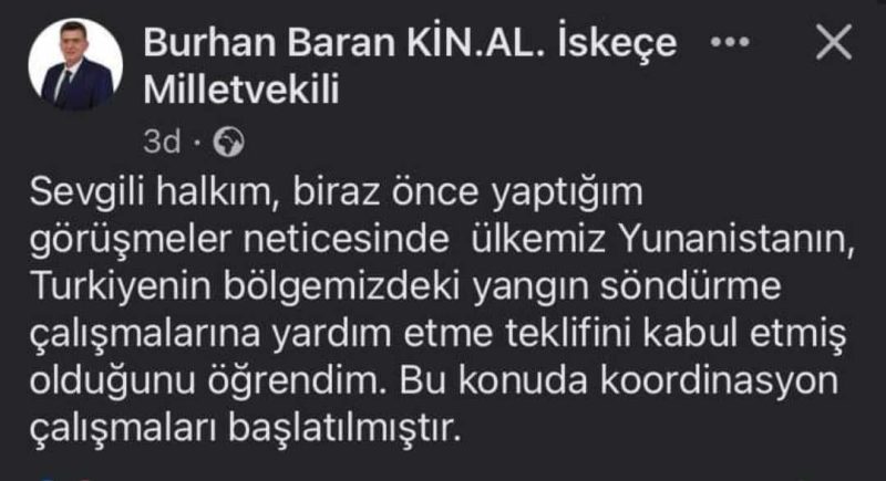 Αγαπητέ μου λαέ, έμαθα πως ως αποτέλεσμα των συνομιλιών που έκανα, η χώρα μας η Ελλάδα αποδέχτηκε την πρόταση της Τουρκίας να βοηθήσει στις εργασίες κατάσβεσης των πυρκαγιών στην περιοχή μας. Άρχισαν οι εργασίες συντονισμού σε αυτό το θέμα.
