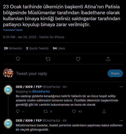 Το κόμμα DEB ( της Άγκυρας…): ¨Ρατσισμός οι επιθέσεις στους χώρους λατρείας των μουσουλμάνων¨….
