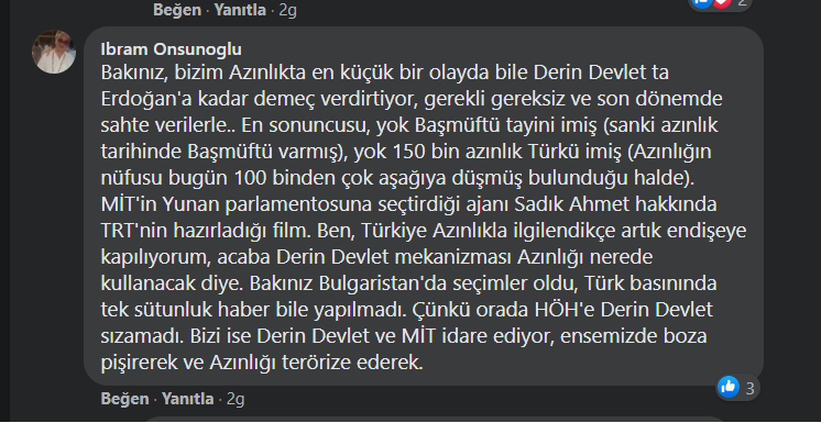 “Δείτε, στην μειονότητα μας στο παραμικρό περιστατικό, το βαθύ κράτος μέχρι και ο Ερντογάν, μας βάζουν να κάνουμε δηλώσεις, είτε χρειάζεται είτε δεν χρειάζεται την τελευταία περίοδο και με πλαστά στοιχεία… Τελευταία διότι λέει διορίστηκε ο αρχιμουφτής (λες και υπήρξε ποτέ στην ιστορία της μειονότητας αρχιμουφτής), αλλά και για την τουρκική μειονότητα των δήθεν 150.000 (Αν και ξέρουν πως ο πληθυσμός της μειονότητας σήμερα είναι αρκετά κάτω από 100.000). Το TRT ετοιμάζει ταινία για τον πράκτορα Σαδίκ Αχμέτ που η ΜΙΤ εξέλεξε στο ελληνικό κοινοβούλιο. Εγώ πλέον όσο βλέπω την Τουρκία να ενδιαφέρεται για τη μειονότητα, ανησυχώ για το που θα χρησιμοποιήσει την μειονότητα ο μηχανισμός του βαθέος κράτους. Δείτε και στη Βουλγαρία έγιναν εκλογές Αλλά στον τουρκικό τύπο ούτε μία είδηση δεν υπήρξε. Διότι εκεί στο κόμμα HOH δεν διείσδυσε το βαθύ κράτος. Ενώ σε εμάς το βαθύ κράτος και η ΜΙΤ κυβερνάνε, ενοχλώντας μας και τρομοκρατώντας την μειονότητα.”