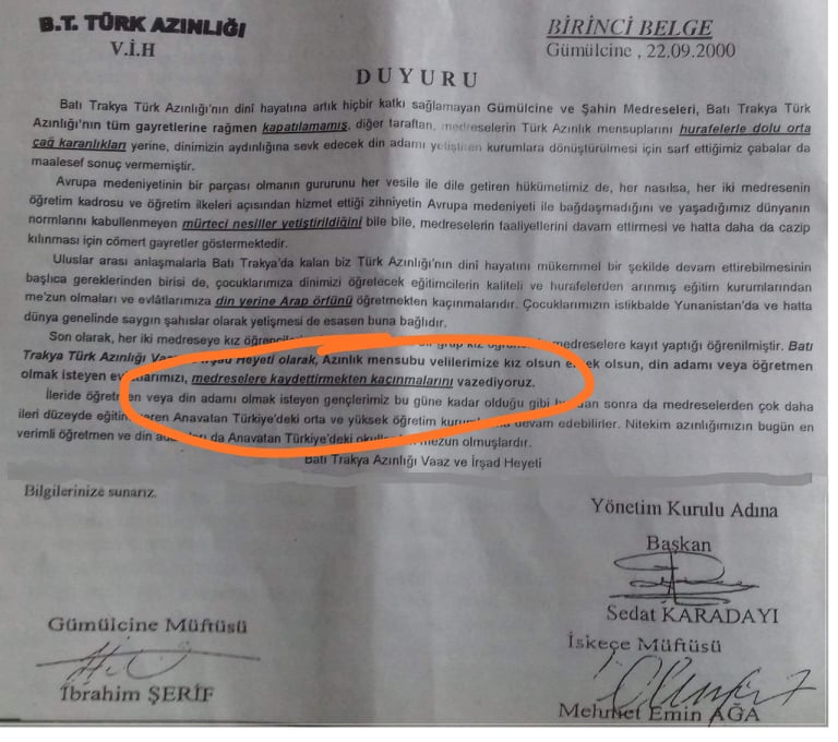 Σας παρουσιάζουμε σήμερα ένα ξεχασμένο έγγραφο πού δείχνει τον τρόπο με τον οποίο λειτουργούν οι άνθρωποι της Τουρκίας στη Θράκη. Πρόκειται για έγγραφο του 2000 και φέρει την υπογραφή των τότε ψευτομουφτηδων Θράκης Ιμπραήμ Σερίφ και Μουσταφά Αγκά. Αναφέρεται στα θρησκευτικά σχολεία (μεντρεσέδες) στα οποία επιτίθεται σφόδρα.