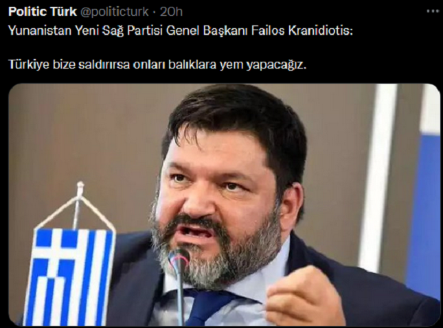 Πρόεδρος του κόμματος της Νέας Δεξιάς στην Ελλάδα Φαϊλος Κρανιδιώτης : ¨Αν μας επιτεθεί η Τουρκία θα τους κάνουμε τροφή για τα ψάρια¨