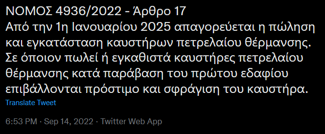 Από την 1η Ιανουαρίου 2025 απαγορεύεται η πώληση και εγκατάσταση καυστήρων πετρελαίου θέρμανσης. Σε όποιον πωλεί ή εγκαθιστά καυστήρες πετρελαίου θέρμανσης κατά παράβαση του πρώτου εδαφίου επιβάλλονται πρόστιμο και σφράγιση του καυστήρα.— Πρόδρομος Ελεύθερος (πρώην Εμφιετζόγλου) (@emphietzoglou) September 14, 2022