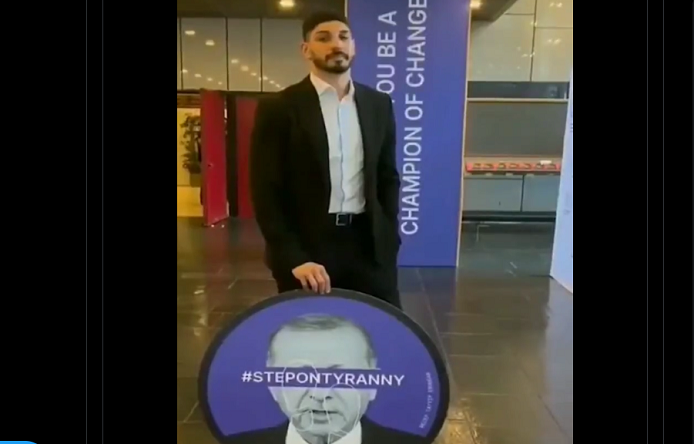 Πατώντας μια αφίσα στην οποία υπάρχει το πρόσωπο του Ταγίπ και η φράση ¨ΠΑΤΑ ΠΑΝΩ ΣΤΗΝ ΤΥΡΑΝΝΙΑ¨