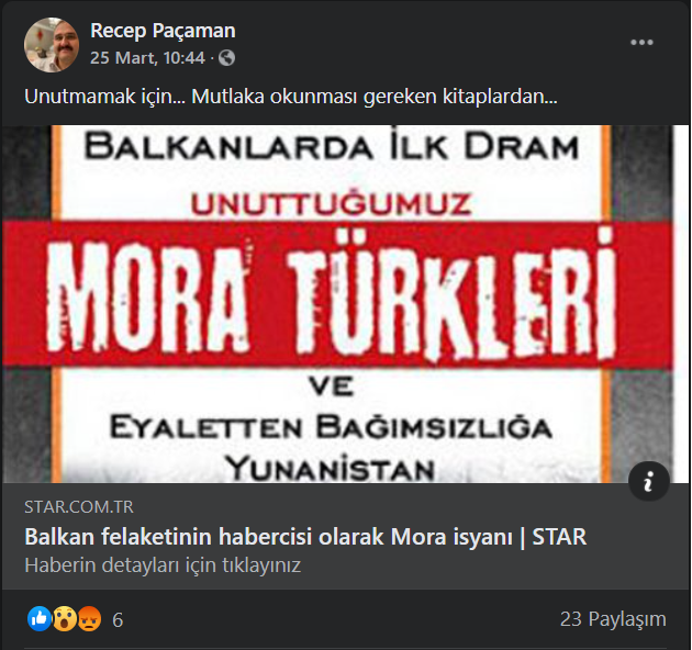 Εδώ σχολιάζει πως ¨Για να μην ξεχαστούν…Από τα βιβλία που πρέπει οπωσδήποτε να διαβαστούν¨ διαφημίζοντας ένα βιβλίο που έχει τίτλο ¨Το πρώτο δράμα στα Βαλκάνια-Οι Τούρκοι του Μοριά που ξεχάσαμε¨….