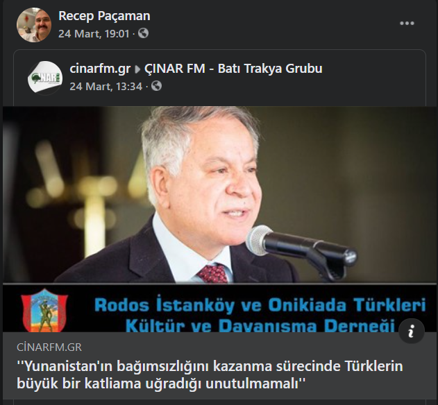 Εδώ αναπαράγει τις δηλώσεις του πράκτορα της Τουρκίας Μουσταφά Καϊμακτσί (ευτυχώς αυτός δεν έχει ελληνική υπηκοότητα) που αναφέρεται στις ¨μεγάλες σφαγές¨ των Τούρκων που έγιναν στο διάστημα που η Ελλάδα κέρδισε την ανεξαρτησία της…