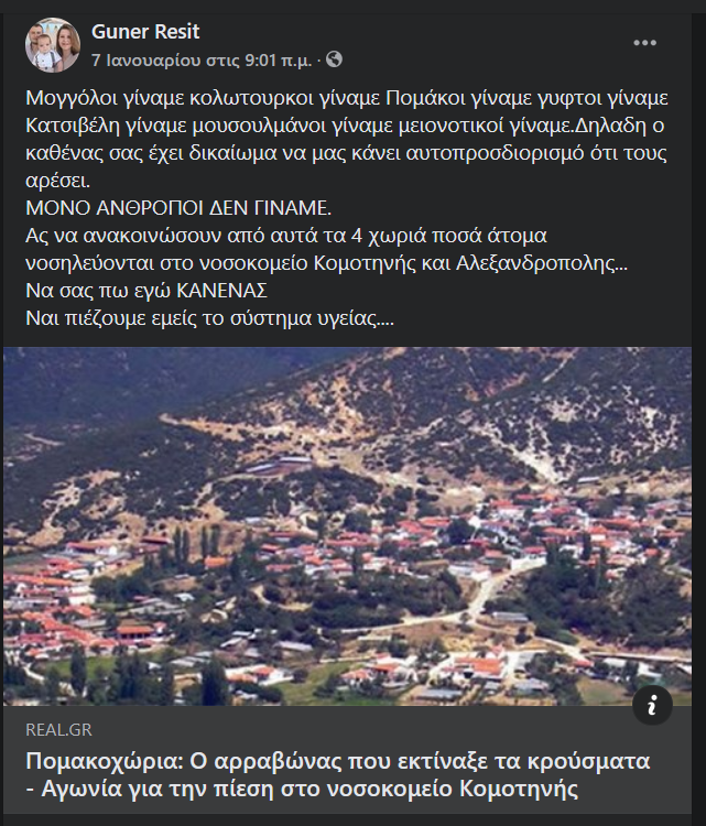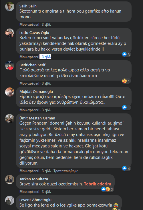 Ανάμεσα στα σχόλια βλέπουμε και αυτό του κ. Ουμίν Μεστάν Οσμάν – πρώην υποψήφιου ευρωβουλευτή του ΣΥΡΙΖΑ και στελέχους εδώ και χρόνια στο πολιτικό γραφείο του βουλευτή Ζεϊμπέκ στην Ξάνθη, ο οποίος γράφει τα εξής : ¨Στην προηγούμενη πανδημία χρησιμοποίησαν τον Εχίνο, ενώ τώρα ήρθε η σειρά σας. Το σύστημα πάντοτε ψάχνει και βρίσκει ένα στόχο. Ένα ακόμη θλιβερό περιστατικό είναι η άνοδος του ακραίου ρατσισμού και φασισμού και οι απίστευτες προσβολές και επιθέσεις κατά των μειονοτικών στα σόσιαλ μίντια. Η πορεία είναι άσχημη και φαίνεται πως θα κλιμακωθεί περισσότερο. Εύχομαι και πάλι περαστικά, όπως και ψυχική και σωματική υγεία¨.
